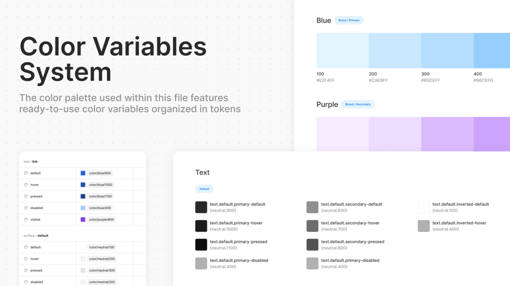 - Detailed systems for Typography scale, Color palette, Number properties for spacing, radius and component sizes, and Iconography