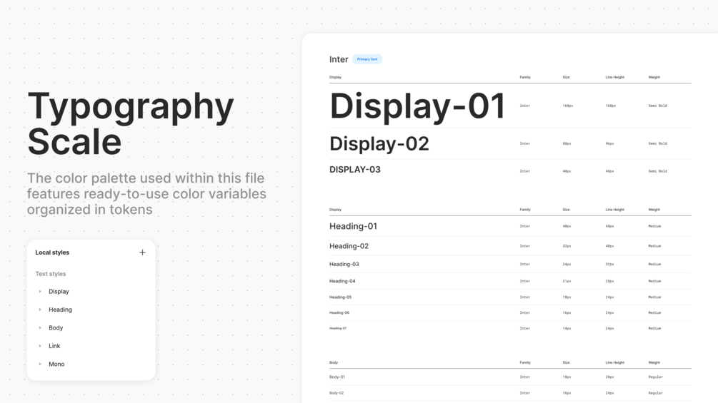 - Detailed systems for Typography scale, Color palette, Number properties for spacing, radius and component sizes, and Iconography